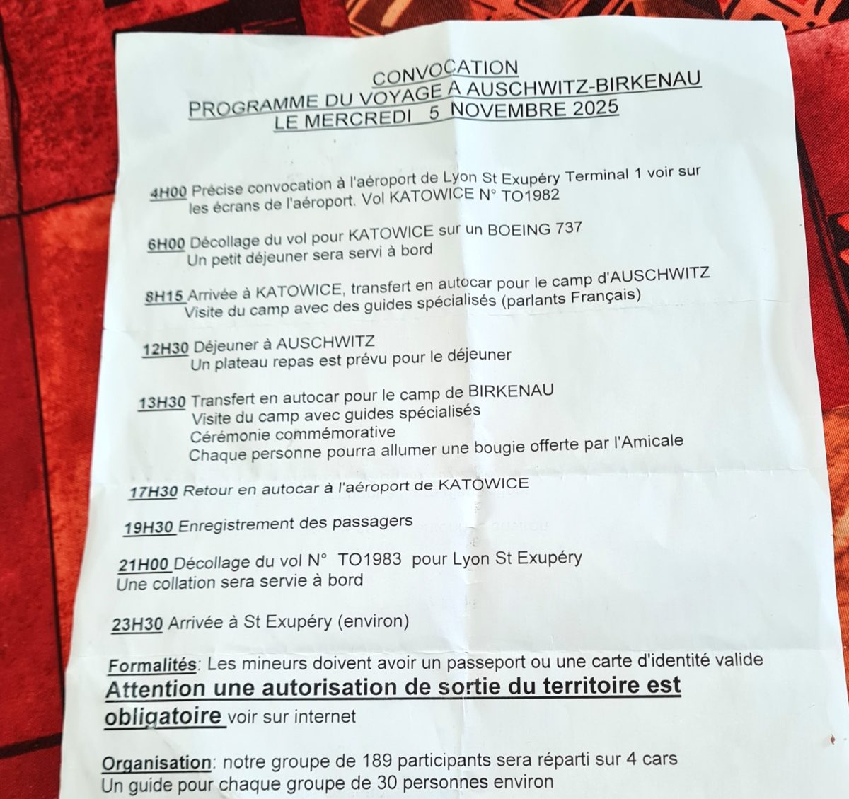 Mercredi 5 novembre 2025, le Boeing 737 portant le vol TP 1982 décollait de l’aéroport Saint-Exupéry à Lyon-Satolas pour Katowice, avec un avion complet et affrété par l’Amicale des déportés d’Auschwitz-Birkenau du Rhône (© Pierre Nouvelle).