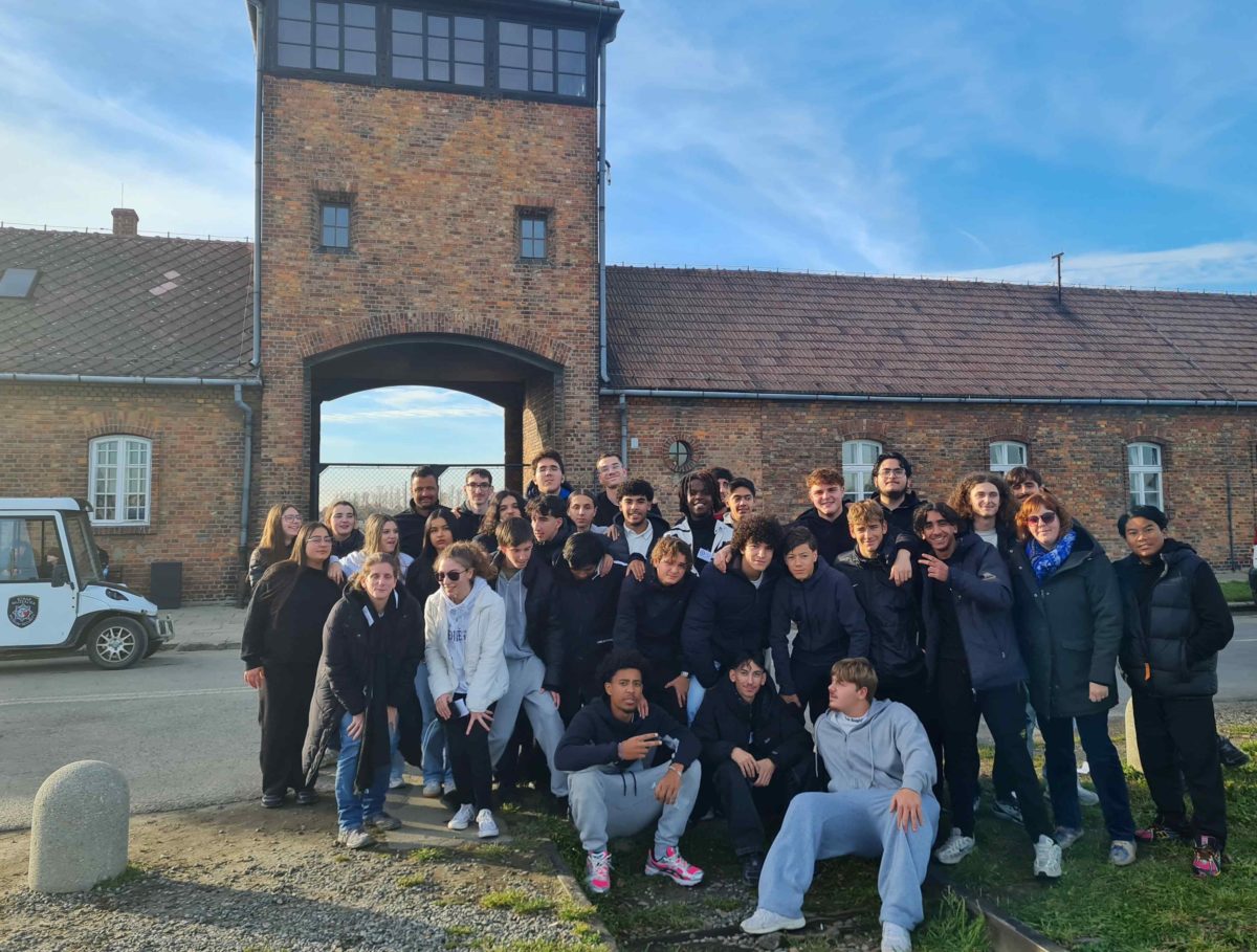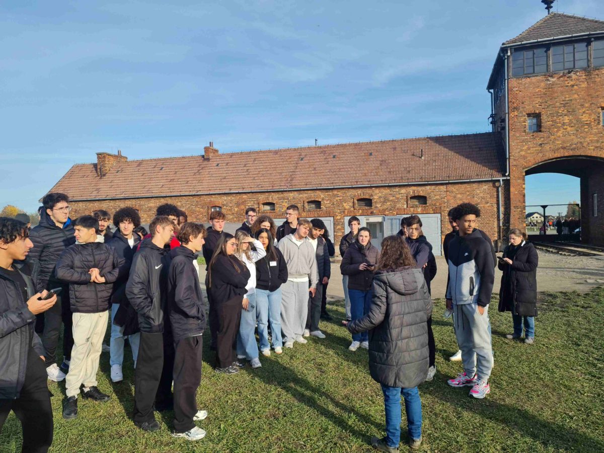 Le trentaine d’élèves du Lycée de l’Édit à Roussillon (Isère) en compagnie de leurs trois accompagnateurs avant d’entrer sur le site d’Auschwitz-Birkenau (© Pierre Nouvelle).