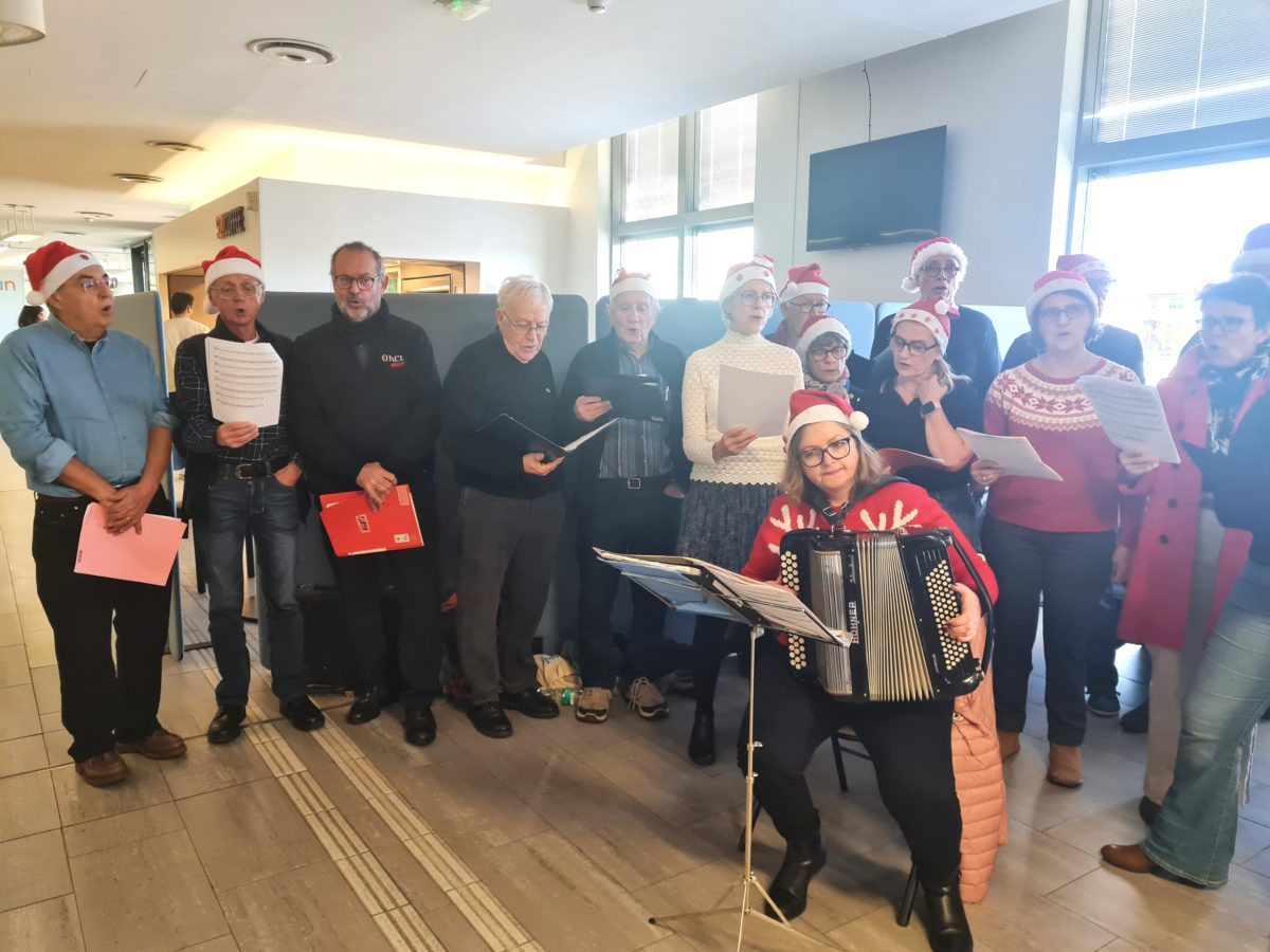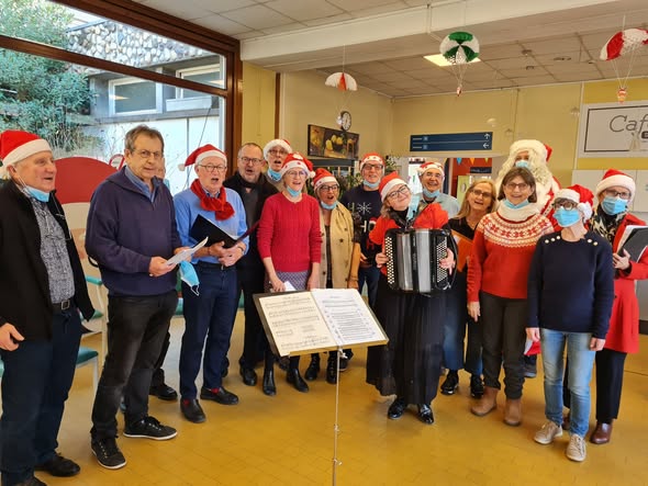 Cette balade musicale s’est poursuivie trois jours plus tard, vendredi 12 décembre 2025 à l’Hôpital Frédéric Dugoujon à Caluire. Dans le hall d’accueil de cette maison gériatrique, puis dans les différents services, ils ont déployé un répertoire qui allait de Mon beau sapin à Mille colombes, en passant par différents chants de cette période de Noël. Un florilège joyeux d’une douzaine de chants, où Il est né le divin’enfant et Les anges dans nos campagnes ne faisaient pas défaut.